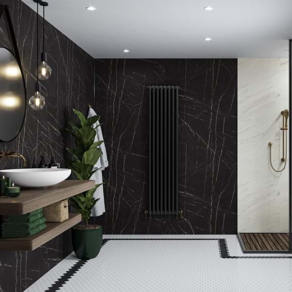Marmer hoeft niet altijd wit te zijn. Black Pietra is een zwart marmerdecor met prachtige witte aders. Door dit cross-over effect is de plaat niet alleen geschikt op zichzelf, maar kan hij ook worden gecombineerd met Levanto marmer uit de Pure collectie om een zwarte wand te creëren.
