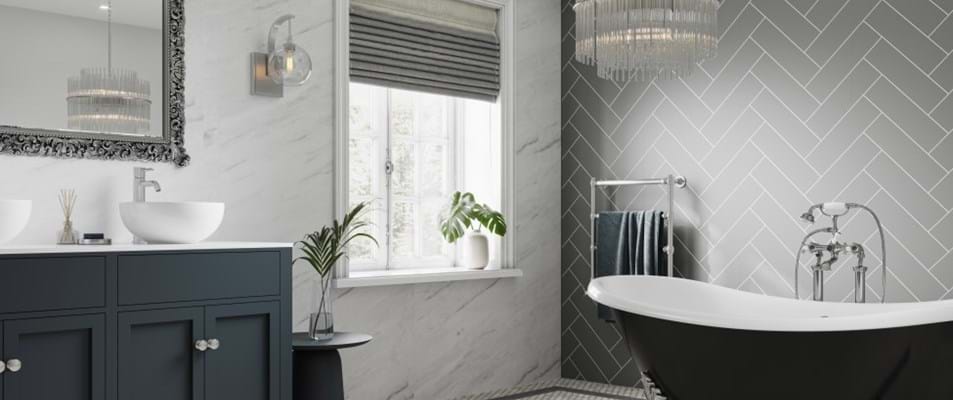 Voeg een vleugje verfijning toe aan je badkamer met Multipanel visgraatpanelen. Gebruik ze op de bovenste of onderste helft van je muren om je badkamer direct te verfraaien. Levanto Marble is een stijlvolle marmeren visgraattegel die er prachtig uitziet als hij op halve hoogte wordt gebruikt.
