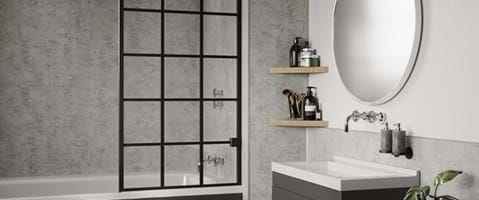 Deze collectie grijze wandpanelen voor de badkamer omvat luxe afwerkingen zoals hout, steen en beton, voor een chique resultaat in uw afgewerkte badkamer.